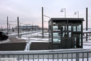 Ausgang des Haltepunkts Mannheim ARENA - Maimarkt, aufgenommen am 20. Dezember 2011. Unmittelbar vor der Station endet die Straßenbahnlinie 6A, im Hintergrund ist die SAP-Arena zu sehen.