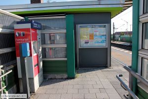 Am Zugang zum Bahnsteig 1 sind der Fahrkartenautomat und Aushänge zu finden. Die Aufnahme ist am 02. September 2011 entstanden.