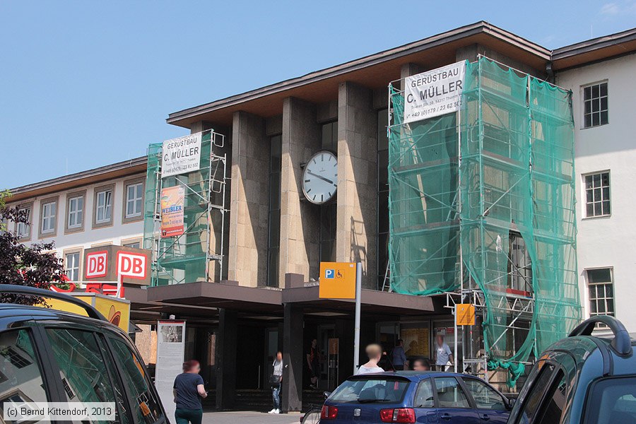 | Trier Hauptbahnhof Eingangsportal des Empfangsgebäudes mit einem Schutzgerüst, aufgenommen am 08. Juni 2013. Als Grund für das Aufstellen des Gerüsts mit grünen Fangnetzen war in der örtlichen Presse zu lesen: Bei einzelnen Platten (der Portalfassade) wurde (in 2010) festgestellt, daß sie nicht mehr ganz so fest verankert sind. Als reine Vorsichtsmaßnahme wurde deshalb das Schutzgerüst errichtet. Photo: Bernd Kittendorf (info@bernd-kittendorf.de) Homepage: www.bernd-kittendorf.de |