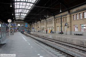 Blick in die Bahnsteighalle mit den Gleisen 1 (ganz rechts im Bild) und 2, aufgenommen am 23. August 2011.