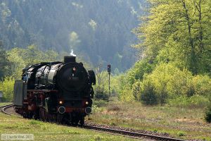 Dampflokomotive 01 1066 der Ulmer Eisenbahnfreunde in Dahn mit einem Sonderzug von Achern nach Bundenthal Rumbach, aufgenommen am 28. April 2007.