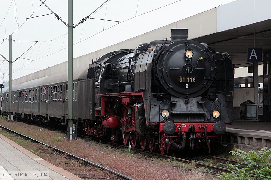 | Dampflok - 01 118 Dampflokomotive 01 118 in Mannheim Hauptbahnhof auf Gleis 2, aufgenommen am 29. Mai 2014. Die vier grünen Wagen sind bei der NESA (Neckar-Schwarzwald-Alb Eisenbahnverkehrsgesellschaft) eingestellt. Dieser Einsatz erfolgte bei der Eisenbahnnostalgieveranstaltung Dampfspektakel 2014. Photo: Bernd Kittendorf (info@bernd-kittendorf.de) Homepage: www.bernd-kittendorf.de |