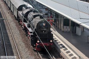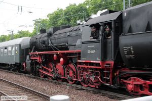 Dampflokomotive 52 4867 bei einem Einsatz in Neustadt (Weinstraße) Hauptbahnhof auf Gleis 3, aufgenommen am 31. Mai 2014. Diese Lokomotive wurde 1943 in Potsdam-Babelsberg gebaut und war zunächst mit der Betriebsnummer 52 4867 in Einsatz. Für die ÖBB war sie bis ins Jahr 1970 im Einsatz, danach folgten etwa zehn Jahre bei der Graz-Köflacher Bahn, weiterhin als Lok 152.4867. Hier ist sie für den Verein Historische Eisenbahn Frankfurt unterwegs.