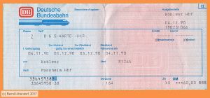 Fahrkarte zum Tarif B&S-Karte für eine Fahrt von Koblenz nach Mannheim Hauptbahnhof und zurück in der 2. Klasse ab 04. November 1990, ausgegeben zum Preis von 60,00 DM am Schalter in Koblenz Hauptbahnhof am 04. November 1990. Verwendet wurde dazu ein Vordruck L 6141 K 90 (05/90). Damals waren noch Entfernungsangaben enthalten, hier km-Zone 164.