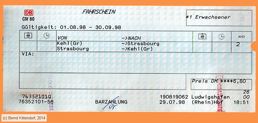 | Deutsche Bahn - Fahrkarte Rückfahrkarte für einen Erwachsenen auf der Strecke von Kehrl (Gr) nach Strasbourg ab 01. August 1998 in der 2. Klasse, ausgegeben am 29. Juli 1998 am Schalter in Ludwigshafen (Rhein) Hauptbahnhof für 6,80 DM. Abmessungen: 200 mm x 85 mm Scan: Bernd Kittendorf (info@bernd-kittendorf.de) Homepage: www.bernd-kittendorf.de |