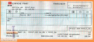 Fahrkarte für eine Fahrt auf der Strecke von Mainz Hauptbahnhof nach Ludwigshafen (Rhein) Hauptbahnhof in der 2. Klasse zur Benutzung am 11. Oktober 2001, ausgegeben zum Normalpreis für 17,00 DM (DEM) am 10. Oktober 2001 am Schalter in Wiesbaden Hauptbahnhof.