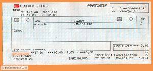 Fahrkarte für eine Fahrt auf der Strecke von Alsheim nach Mainz Hauptbahnhof in der 2. Klasse, ausgegeben am 22. Dezember 2001 für 10,40 DM (DEM) am Schalter in Ludwigshafen (Rhein) Hauptbahnhof. Inzwischen gibt es dort keinen Fahrkartenschalter mehr.