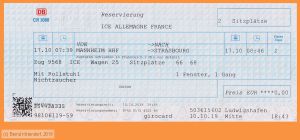 Reservierung für die Sitzplätze 66 und 68 im Wagen 25 im Zug ICE 9568 am 17. Oktober 2019 von Mannheim Hauptbahnhof nach Strasbourg, ausgedruckt am 10. Oktober 2019 am Schalter in Ludwigshafen (Rhein) Mitte. Es handelt sich um Plätze für einen Rollstuhl-Benutzer und einen Begleiter. Die Reservierung enthält den Hinweis Zugtüren schließen in Frankreich zwei Minuten vor Abfahrt, unwichtig für die, die beim ersten Halt in Frankreich aussteigen. Als Fahrzeit werden planmäßig eine Stunde und sieben Minuten benötigt.