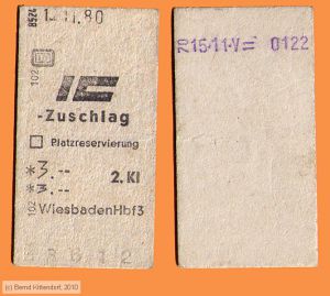 EC/IC-Zuschlag ohne Reservierung, ausgegeben am 04. Januar 1990 für 6,00 DM am Schalter des Bahnhofs Wiesbaden-Igstadt. Die Rückseite (rechts im Bild) zeigt den Stempelabdruck der Ausgabestelle und den Zangenabdruck aus dem Zug.
