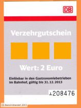 Anläßlich von erheblichen Zugverspätungen werden Verzehrgutscheine ausgegeben. Dieser hier hat einen aufgedruckten Wert von 2,00 EUR und ist in Gastronomiebetrieben im Bahnhof bis 31. Dezember 2013 einlösbar.
