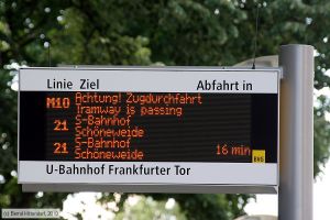Fahrgastinformation an der Haltestelle U Frankfurter Tor, aufgenommen am 17. Juni 2010. Die Linien M10 (Zweirichtungswagen) und 21 (KT4D) halten an unterschiedlichen Bahnsteigen, daher die Ankündigung einer Zugdruchfahrt.