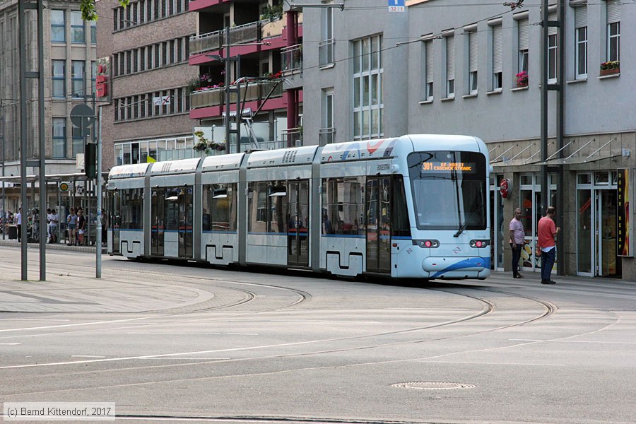 | Straßenbahn Bochum-Gelsenkirchen - 110 Triebwagen 110 auf Linie 301 nach Gelsenkirchen Horst - Essener Straße bei der Ankunft an der Haltestelle Gelsenkirchen - Buer Rathaus / Kunstmuseum, aufgenommen am 20. Juni 2017. Dieser Niederflurgelenktriebwagen vom Typ Variobahn vom Hersteller Stadler ist seit 2017 im Bestand. Photo: Bernd Kittendorf (info@bernd-kittendorf.de) Homepage: www.bernd-kittendorf.de |