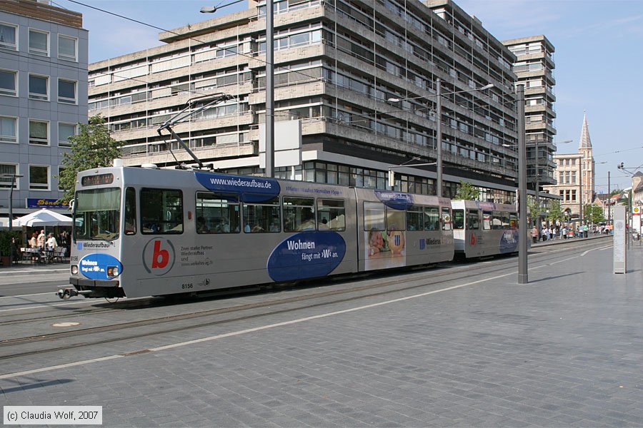 | Braunschweig - Straßenbahn - 8156 Triebwagen 8156 mit Beiwagen 8178 bei der Haltestelle Rathaus, aufgenommen am 24. August 2007. Photo: Claudia Wolf (info@claudia-blondie-wolf.de) Homepage: www.claudia-blondie-wolf.de |