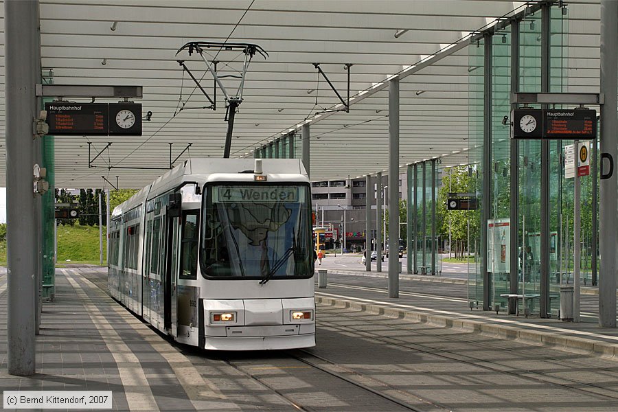 | Braunschweig - Straßenbahn - 9562 Triebwagen 9562 auf Linie 4 nach Wenden an der Haltestelle Hauptbahnhof, aufgenommen am 03. August 2007. Photo: Bernd Kittendorf (info@bernd-kittendorf.de) Homepage: www.bernd-kittendorf.de |