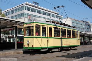 Triebwagen 113 als Sonderfahrt an der Haltestelle Schloss, aufgenommen am 22. August 2015. Links im Bild steht Triebwagen 0759 auf Linie M1 nach Stöckheim. Diese während der Bauarbeiten benutzte Haltestelle hat keine richtigen Bahnsteige.