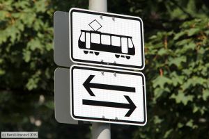 Hinweis auf Straßenbahnen in beiden Richtungen an einem Überweg bei der Haltestelle Weststadt - Weserstraße, aufgenommen am 22. August 2015.
