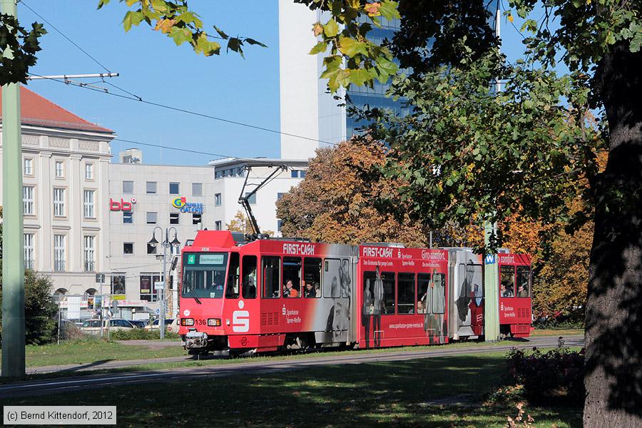 | Straßenbahn Cottbus - 136 Triebwagen 136 auf Linie 4 nach Sachsendorf bei der Stadthalle, aufgenommen am 19. Oktober 2012. Photo: Bernd Kittendorf (info@bernd-kittendorf.de) Homepage: www.bernd-kittendorf.de |