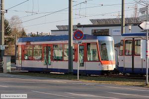 Beiwagen 9429 auf Linie 4 nach Griesheim bei der Abfahrt von der Haltestelle Kranichstein Bahnhof, aufgenommen am 17. März 2016. Vorn am Zug befindet sich Triebwagen 9123 (links am Bildrand).