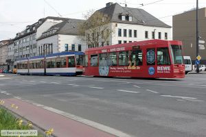 Triebwagen 9859 (links im Bild) mit Beiwagen 9435 (rechts im Bild) auf Linie 9 bis Böllenfalltor bei der Abfahrt von der Haltestelle Rhein-/Neckarstraße, aufgenommen am 05. April 2017.