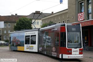 Triebwagen 309 auf Linie 3 nach Junkerspark bei der Abfahrt vom Hauptbahnhof, aufgenommen am 14. Mai 2006. Das Fahrzeug ist 21,05 m lang (Wagenkasten), 2,30 m breit und hat einen Niederfluranteil von 45% (bezogen auf die Fahrzeuglänge). Als Höchstgeschwindigkeit ist 70 km/h vorgesehen. Die Dauerleistung beträgt 4x85 kW.