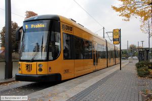 Triebwagen 2628 auf Linie 9 nach Prohlis, aufgenommen an der Haltestelle Kaditz Riegelplatz am 16. Oktober 2013.