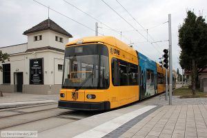 Triebwagen 2707 auf Linie 10 an der Haltestelle Messe Dresden, aufgenommen am 16. August 2012.