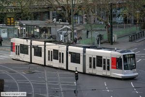 Triebwagen 2206 auf Linie 707 zur Universität bei der Abfahrt von der Haltestelle Düsseldorf Hauptbahnhof, aufgenommen am 25. März 2004 in der Graf-Adolf-Straße.