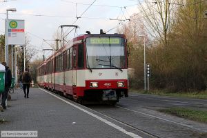 Triebwagen 4102 (noch mit Rollband-Anzeige und Rheinbahn-Bistro) auf Linie U76 nach Düsseldorf Hauptbahnhof in Krefeld am Hauptbahnhof, aufgenommen am 14. März 2006.