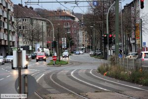 Gleise der Linie 903 zwischen den Haltestellen Platanenhof und Brückenplatz, aufgenommen am 24. November 2009. Nach links zweigt die Strecke der Linie U79 in Richtung Düsseldorf ab.