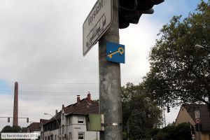 Schlüsselschalter und blaue Hinweis-Tafel mit gelbem Schlüssel an der Kreuzung mit der Werkseinfahrt an der der Haltestelle Mannesmann Tor 1, aufgenommen am 02. September 2013.