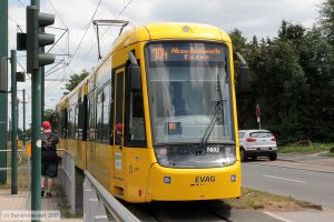 Triebwagen 1610 auf Linie 101 an der Haltestelle Helenenstraße, aufgenommen am 18. Juni 2017. Das Fahrzeug ist ein Niederflur-Gelenktriebwagen in Zweirichtungsbauart des Typs Flexity Classic oder auch M8D-NF2 vom Hersteller Bombardier aus dem Jahr 2014. Es ist dreiteilig, achtachsig und der Niederflur-Anteil beträgt 70 %. Der Triebwagen trägt den Namen Essen Kettwig.