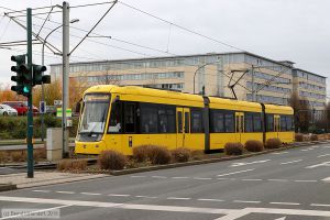 Triebwagen 1606 auf Linie 106 zum Germaniaplatz bei der Abfahrt von der Haltestelle thyssenkrupp, aufgenommen am 26. November 2019.