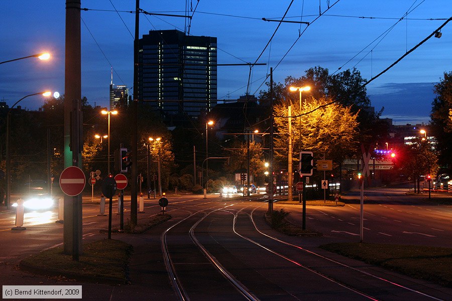 | Straßenbahn Essen - Anlagen Gleise bei der Haltestelle Am Freistein, aufgenommen am Abend des 21. Oktober 2009. Nach links führt eine Betriebsstrecke, geradeaus geht es zum Tunnel zur Haltestelle Viehofer Platz. Photo: Bernd Kittendorf (info@bernd-kittendorf.de) Homepage: www.bernd-kittendorf.de |