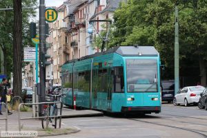 Triebwagen 014 auf Linie 15 nach Niederrad - Haardtwaldplatz bei der Abfahrt von der Haltestelle Stresemannallee / Gartenstraße, aufgenommen am 18. Juni 2018.