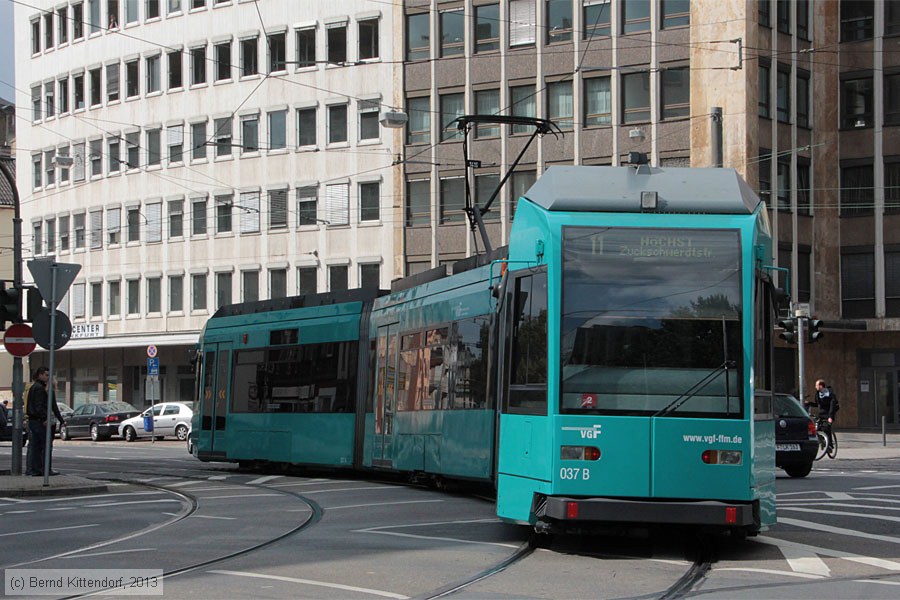 | Straßenbahn Frankfurt (Main) - 037 Triebwagen 037 auf Linie 11 nach Höchst - Zuckschwerdtstraße bei der Abfahrt von der Haltestelle Platz der Republik, aufgenommen am 12. September 2013. Photo: Bernd Kittendorf (info@bernd-kittendorf.de) Homepage: www.bernd-kittendorf.de |