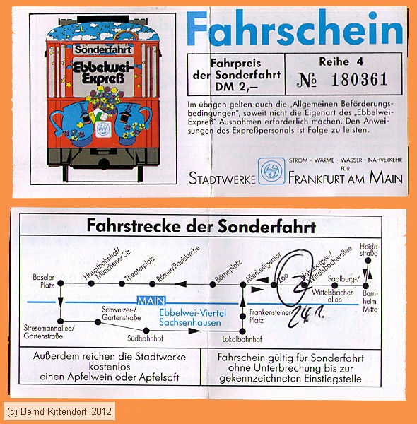 | Straßenbahn Frankfurt (Main) - Fahrschein Ebbelwei-Expreß Mit dieser Fahrkarte konnte man in den speziell hergerichteten Straßenbahnwagen des Ebbelwei-Expreß durch Frankfurt am Main fahren. Auf der Rückseite der Fahrkarte (unten im Bild) ist die Strecke abgebildet. Laut Aufdruck war ein Getränk (Apfelwein oder Apfelsaft) im Fahrpreis von 2,00 DM inbegriffen. Abmessungen: 124 mm x 60 mm Scan: Bernd Kittendorf (info@bernd-kittendorf.de), Fahrkarte aus der Sammlung von Detlef W. Kettner. Homepage: www.bernd-kittendorf.de |