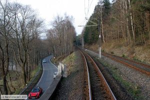 Zwischen der Haltestelle Marienglashöhle und der Endstelle in Tabarz führt das Gleis durch dichten Wald. Die Aufnahme ist am 13. April 2010 entstanden.
