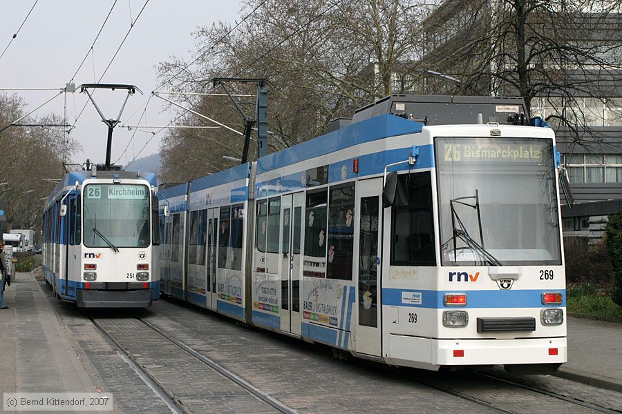 | Straßenbahn Heidelberg - 269 Triebwagen 251 (links im Bild) auf Linie 26 nach Kirchheim und Triebwagen 269 (rechts im Bild) auf Linie 26 zum Bismarckplatz an der Haltestelle Stadtbücherei, aufgenommen am 14. März 2007. Photo: Bernd Kittendorf (info@bernd-kittendorf.de) Homepage: www.bernd-kittendorf.de |