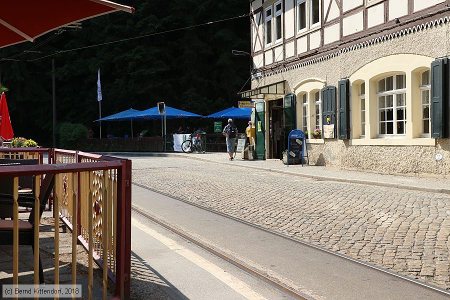 | Kirnitzschtalbahn - Anlagen Gleise bei der Haltestelle Lichtenhainer Wasserfall, aufgenommen am 29. Mai 2018. In der Gaststätte und Pension Lichtenhainer Wasserfall (rechts im Bild) waren wir für Kaffee & Kuchen, es hat gut geschmeckt und wir wurden freundlich bedient. Photo: Bernd Kittendorf (info@bernd-kittendorf.de) Homepage: www.bernd-kittendorf.de |