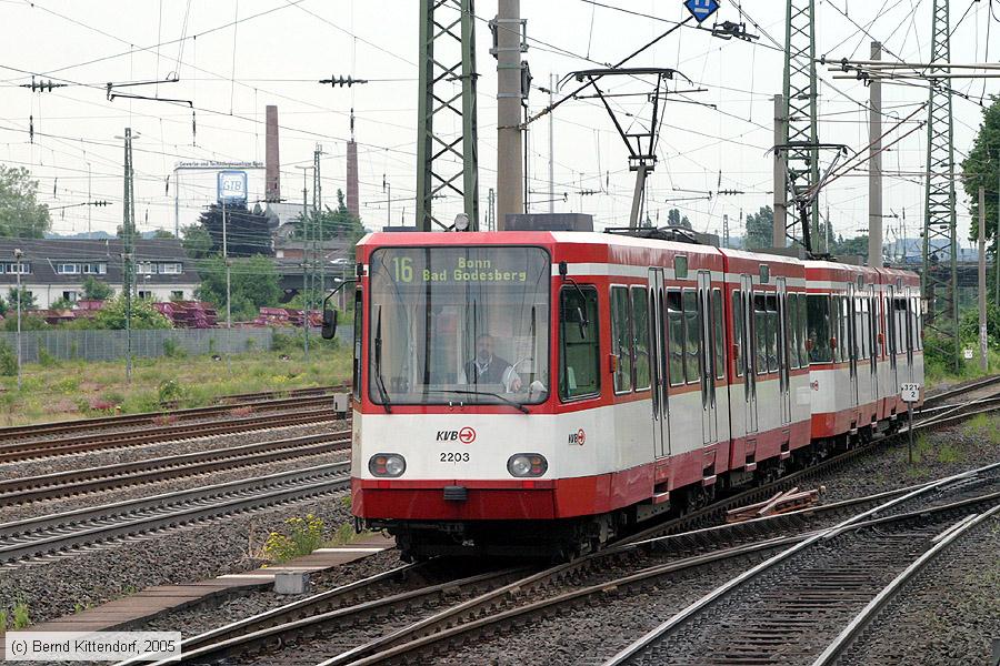 | Stadtbahn Köln - 2203 Triebwagen 2203 auf Linie 16 nach Bonn - Bad Godesberg bei der Ankunft an der Haltestelle Bonn West, aufgenommen am 31. Mai 2005. Als zweites Fahrzeug im Zug ist Triebwagen 2205 (rechts im Bild) zu sehen. Photo: Bernd Kittendorf (info@bernd-kittendorf.de) Homepage: www.bernd-kittendorf.de |