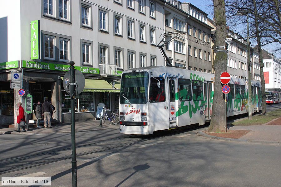 | Straßenbahn Krefeld - 840 Triebwagen 840 auf Linie 043, aufgenommen am 14. März 2006 zwischen Rheinstraße und Hauptbahnhof. Photo: Bernd Kittendorf (info@bernd-kittendorf.de) Homepage: www.bernd-kittendorf.de |