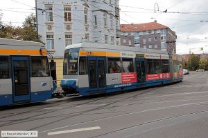 Triebwagen 1303 auf Linie 14 nach Plagwitz bei der Haltestelle Felsenkeller, aufgenommen am 05. Oktober 2011.