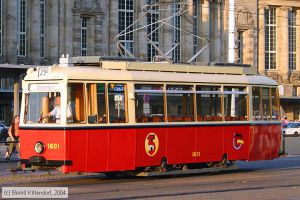 Triebwagen 1601 am 09. August 2004 vor dem Leipziger Hauptbahnhof als Linie 29E.