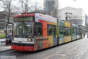 Triebwagen 204 auf Linie 3 am Berliner Platz, aufgenommen am 27. März 2004. Der markante Rundbau im Hintergrund, die Tortenschachtel, wurde im Jahr 2015 abgerissen. Über 50 Jahre prägte das runde Kaufhaus mit seiner Fassade aus Aluminium und Glas in unterschiedlichen Grüntönen das Stadtbild und wurde zu einer Art Wahrzeichen. Nach dem Abbruch bestimmte die Baugrube das Stadtbild für Jahre.