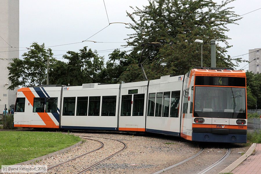 | Straßenbahn Ludwigshafen - 2208 Triebwagen 2208 auf dem äußeren Gleis der Wendeschleife in Ludwigshafen Oggersheim, aufgenommen am 20. Juni 2016. Photo: Bernd Kittendorf (info@bernd-kittendorf.de) Homepage: www.bernd-kittendorf.de |