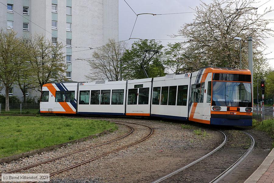 | Straßenbahn Ludwigshafen - 2209 Triebwagen 2209 in Ludwigshafen auf dem äußeren Gleis der Wendeschleife an der Endstelle Oggersheim, aufgenommen am 13. April 2023. Photo: Bernd Kittendorf (info@bernd-kittendorf.de) Homepage: www.bernd-kittendorf.de |