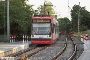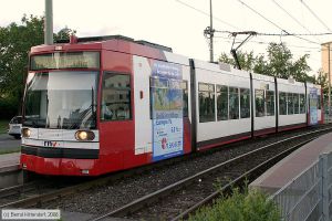 Triebwagen 209 auf Linie 7 in Mannheim bei der Haltestelle Universitätsklinikum, aufgenommen am 24. Juni 2009.