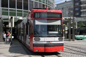 Triebwagen 209 auf Linie 6 nach Rheingönheim bei der Abfahrt von der Haltestelle Berliner Platz, aufgenommen am 10. Juli 2008.