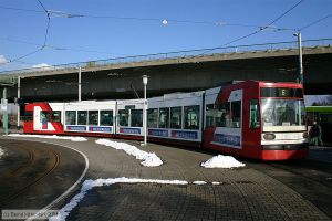 Triebwagen 209 auf Linie 4 in Ludwigshafen Oggersheim zwischen den Haltestellen Mannheimer Tor und Hans-Warsch-Platz, aufgenommen am 09. März 2007.