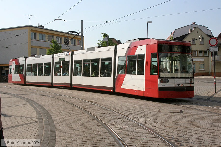 | Straßenbahn Ludwigshafen - 209 Triebwagen 209 auf Linie 4 nach Bad Dürkheim in Oggersheim bei der Abfahrt von der Haltestelle Hans-Warsch-Platz, aufgenommen am 20. April 2009. Photo: Bernd Kittendorf (info@bernd-kittendorf.de) Homepage: www.bernd-kittendorf.de |